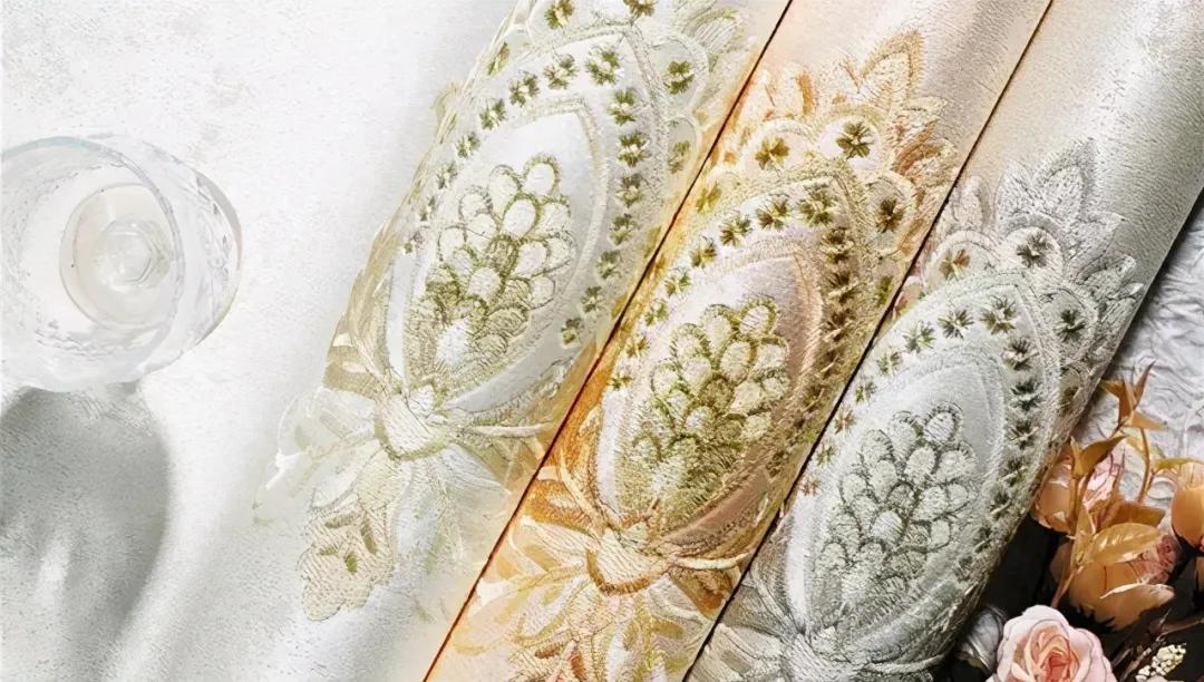 刺绣布,立体感强,花型比较突出,因为是机器绣出来的,所以看起来花色呆板,用久了绣线会松掉,议小面积使用,别整屋贴了。